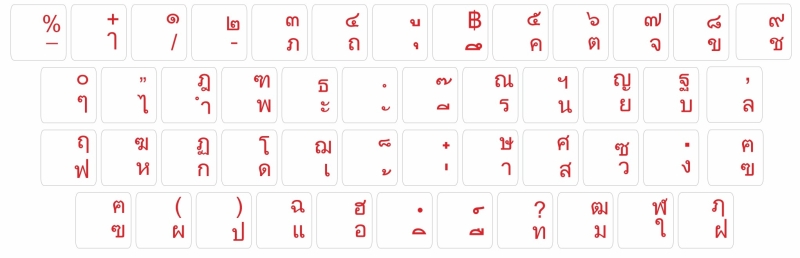 Die hochwertigen Tastaturaufkleber THAILÄNDISCH (Thai Kedmanee Layout) mit roter Schrift und transparenter Folie eignen sich perfekt, um helle oder schwarze PC-, Notebook- oder Laptop-Tastaturen schnell und sauber mit thailändischen Schriftzeichen zu ergänzen. Durch den transparenten Hintergrund bleibt das originale Tastaturdesign erhalten, während die rote Beschriftung einen klaren, gut sichtbaren Kontrast auf hellen oder dunklen Tasten bietet.